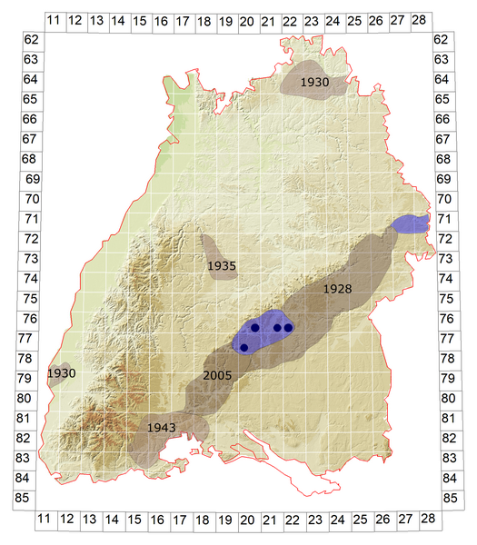 Grauer Bereich: Ehemalige Vorkommen (letztes Nachweisdatum)