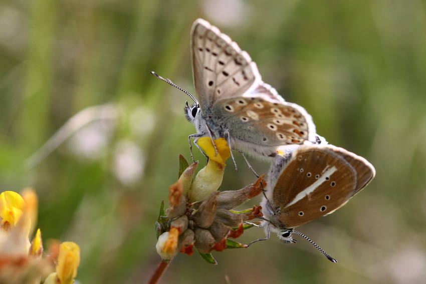 Fehlpaarung eines Weibchens des Weißdolch-Bläulings mit einem Männchen des Silbergrünen Bläulings (Lysandra coridon) auf der Schwäbischen Alb (Oberstetten), Juli 2019.
