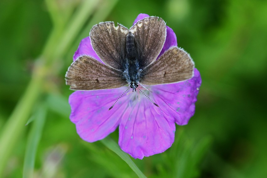Weiterer aberrativer Storchschnabel-Bläuling mit fehlendem weißen "Wisch" im Albvorland (Holzgerlingen), Juni 2018.
