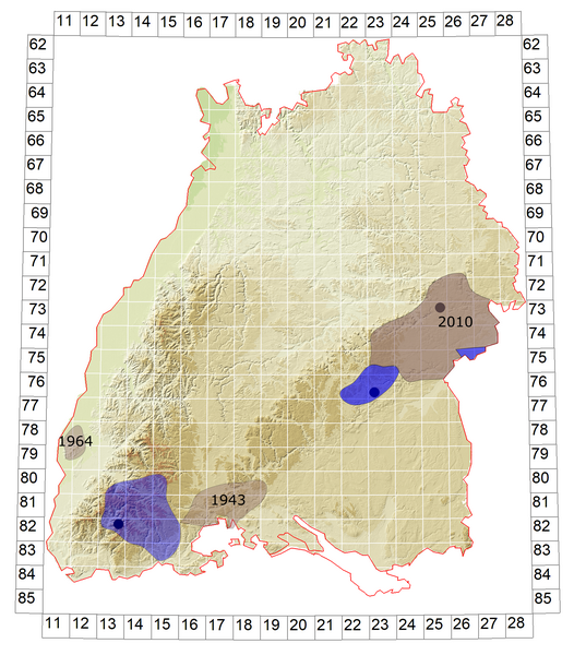 Grauer Bereich: Ehemalige Vorkommen (letztes Nachweisdatum)