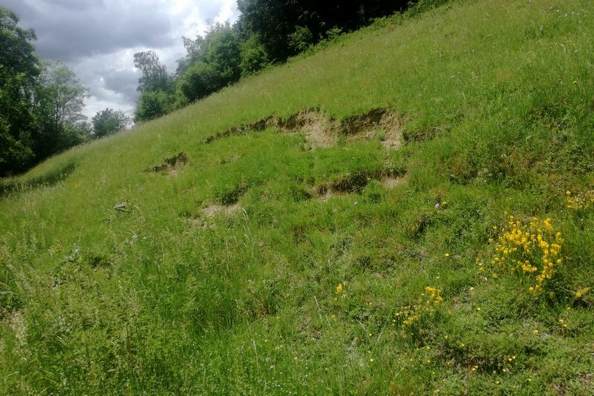 Habitat des Graublauen Thymian-Bläulings im Südschwarzwald (Schönau); von Rindern beweideter Silikat-Magerrasen mit reichlich Offenbodenstellen und Thymian.