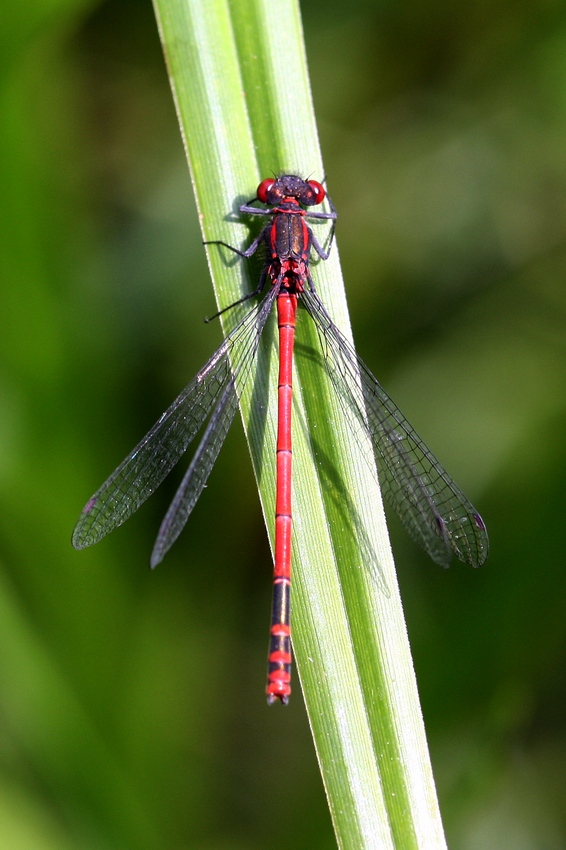 Aufsicht auf ein Männchen der Frühen Adonislibelle (Pyrrhosoma nymphula) im Albvorland (Waldenbuch), Juni 2013.
