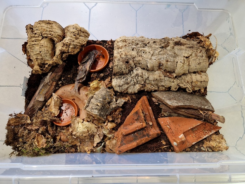 Im Oktober 2023 erhielt ich fünf kleine Nachzuchten dieser interessanten Salamanderart. Die Tiere maßen zu diesem Zeitpunkt nur etwa 2-3 cm Gesamtlänge. Sie bezogen eine Plastikbox mit den Maßen 50x30x20 cm. In den Deckel ist ein Loch ausgeschnitten, der für den notwendigen Luftaustausch sorgt. Ein Tuch aus weicher Gaze zwischen Deckel und Behälter sorgt dafür, dass die kleinen Salamander nicht ausbrechen können. Als Drainageschicht ist Kies eingebracht, darüber ein Gemisch aus Erde, Laubwaldhumus und etwas Sand. Zahlreiche Rinden- und Tonstücke bieten den Brillensalamandern Versteckmöglichkeiten in verschiedenen Feuchtegraden. In einer Ecke ist eine kleine Wasserschale eingebracht sowie etwas feuchtes Sphagnummoos. Die Box ist bestückt mit Weißen Asseln und Springschwänzen, zusätzlich füttere ich mit flugunfähigen, kleinen Drosophila, Mikroheimchen und jungen Ofenfischchen. Die kleinen Salamander sollten möglichst "im Futter stehen", damit sie schnell und gut wachsen. Die Box wird nicht beleuchtet, die Temperaturen liegen bei Raumtemperatur (17-21 °C tagsüber, 14-17 °C nachts). Alle drei bis vier Tage wird die Box kräftig überbraust. Die Brillensalamander sind vor allem abends nach dem Sprühen auch zu sehen, wenn sie aktiv nach Beute jagen.