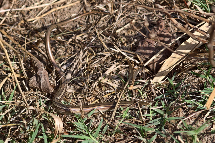 Die Italienische Erzschleiche (Chalcides chalcides) sonnt sich morgens im schütteren Gras der Aue des Cedrino.
