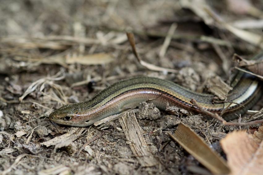 Portrait der Italienischen Erzschleiche, gut ist der gestreifte Körper zu erkennen.