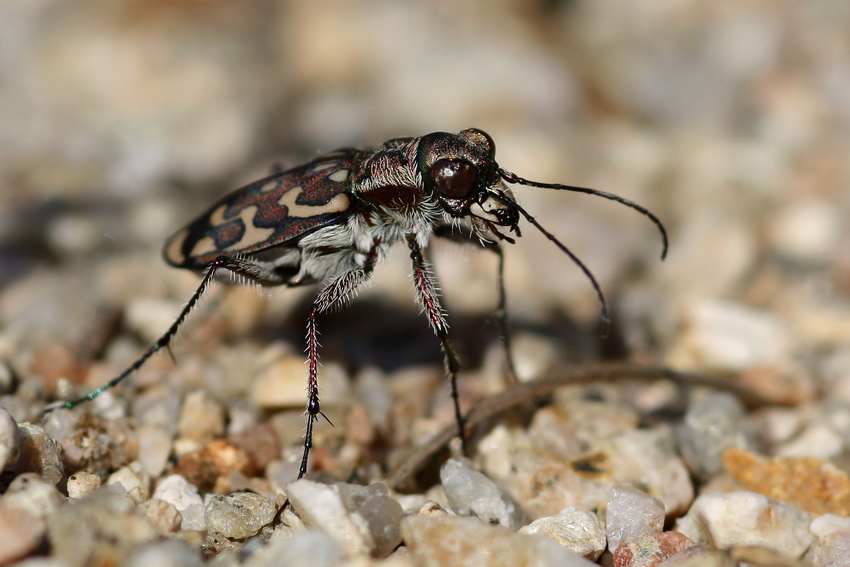 Bislang noch unbestimmter Sandlaufkäfer (Cicindelidae), der sich an schütteren Uferbereichen des Cedrino aufhielt.