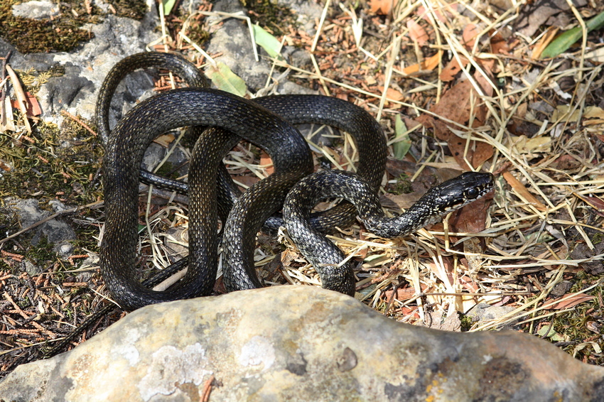 Recht dunkel gefärbtes Exemplar der Gelbgrünen Zornnatter (Hierophis viridiflavus) am Fuße des Monte Albo-Gebirges.