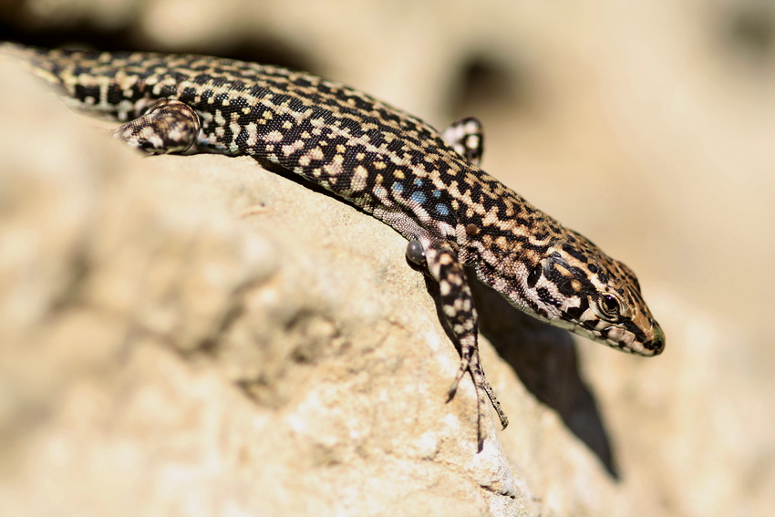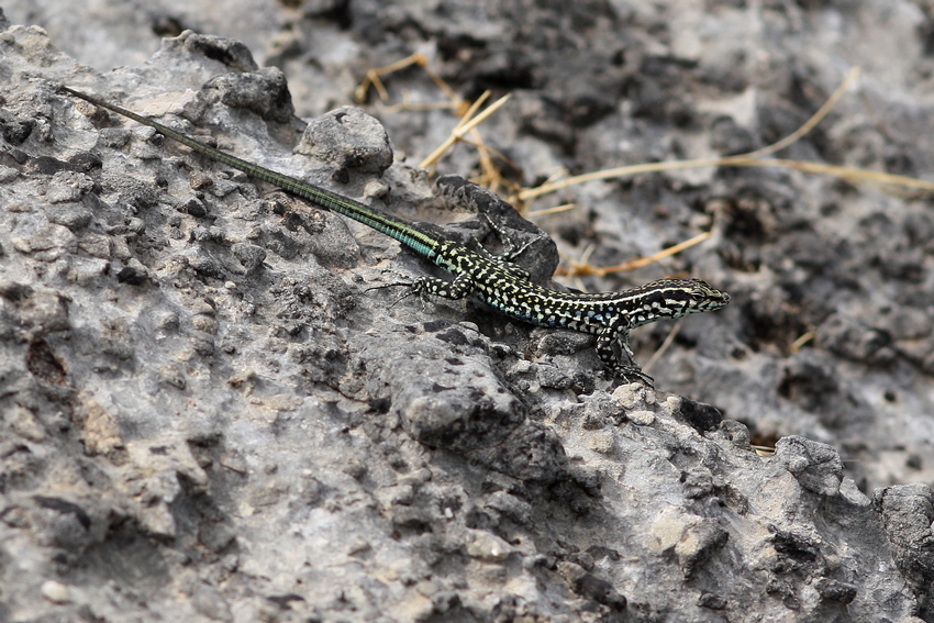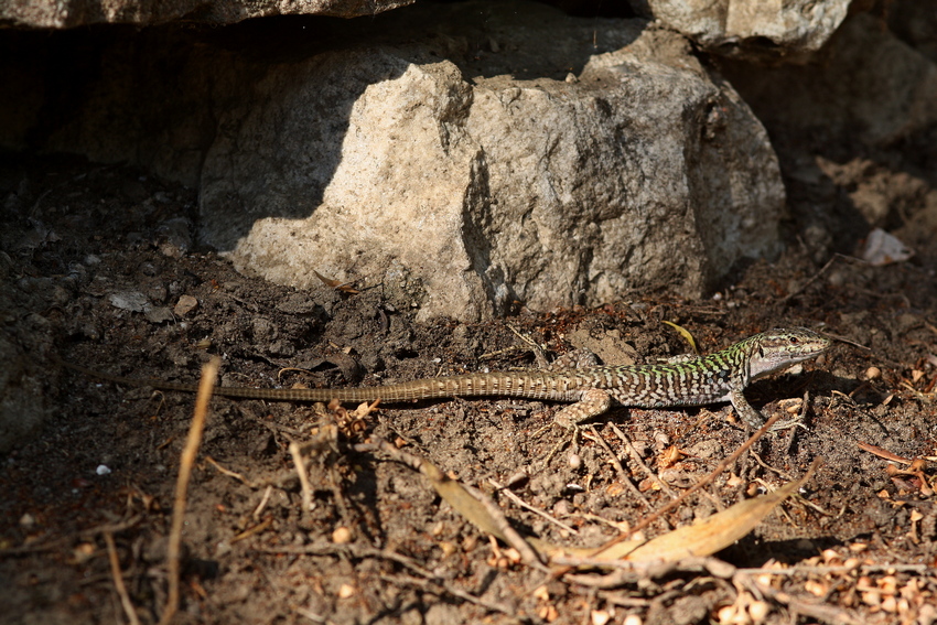 Unsere erste herpetologische Exkursion unternahmen wir in das Monte Albo-Gebirge, das sich südwestlich von Siniscola über ca. 20 km auf eine Höhe von knapp über 1.000 m NN erstreckt. Hier kommt der für das Gebirge endemische Höhlensalamander Speleomantes flavus vor. Da wir mitten im Hochsommer (August) unterwegs waren, hatten wir bereits einige Höhlen vorausgewählt, in denen wir uns Chancen auf die Art ausrechneten. Die erste Höhle direkt in Siniscola war jedoch mit einem Eisentor verschlossen und nur nach terminlicher Vereinbarung zu erkundschaften, was wir am Ende unserer Reise tatsächlich noch in die Tat umsetzten, dazu aber später mehr. Immerhin wies eine Informationstafel bereits auf den Monte Albo-Höhlensalamander hin. Die zweite und dritte ausgewählte Höhle lagen jeweils mitten im steilen und felsigen Abhang des Gebirgsstockes, für uns ohne realistische Chance, diese mit einem 10-jährigen Kind zu erreichen. Doch eine direkt anfahrbare Höhle hatten wir noch in der Auswahl. Auf dem Weg dorthin kroch uns eine subadulte Gelbgrüne Zornnatter über den Weg und einige Tyrrhenische Mauereidechsen - für uns ein Novum - zeigten sich. An der Höhle angekommen, entdeckten wir Klamotten, Neoprenanzüge und eine Drohne - offenbar war bereits Besuch in dieser Höhle. Der Abstieg über ein Seil in das dunkle Loch war nicht ohne und wir trauten uns nicht weiter in die Höhle hinein. So mussten wir vorerst unverrichteter Dinge wieder abziehen. Immerhin entschädigten uns die zahlreichen Tyrrhenischen Mauereidechsen, die auf den Felsblöcken vor dem Höhleneingang lebten. Sie zeigten sich sehr scheu, jedoch dafür in allen Größen und Farben, wobei vor allem die bunt und kontrastreich gefärbten Männchen beeindruckten. Fast wieder am Auto angekommen, hörten wir Stimmen, die aus der Richtung des Höhleneingangs kamen. Wir warteten also ab und trafen auf einen Deutschen und eine Holländerin, die im Rahmen eines privaten Forschungsprojekts dabei waren, diese Höhle genauer zu erkunden. Sie boten an, uns tiefer in die Höhle hinein zu begleiten, was wir natürlich dankbar annahmen. Also ging es über das Seil wieder hinunter und dieses Mal entlang von Sicherungsseilen, Felsen und Höhlengewässern so weit hinein, bis man nur noch tauchend vorankam. Ein beeindruckendes Erlebnis in einer Höhle, die bis heute nicht vollständig erfroscht und deren verzweigtes System nur mittels riskanter Höhlentauchgänge zu erkunden ist. Leider konnten wir trotz dieser einzigartigen Möglichkeit, die Höhle genauer in Augenschein zu nehmen, keine Höhlensalamander finden und kehrten ohne das große Erfolgserlebnis wieder in unsere Ferienwohnung zurück.