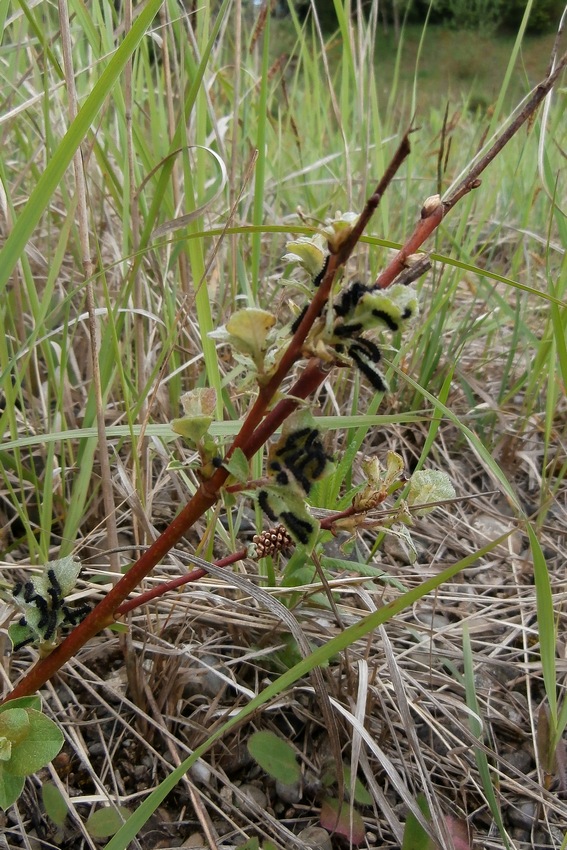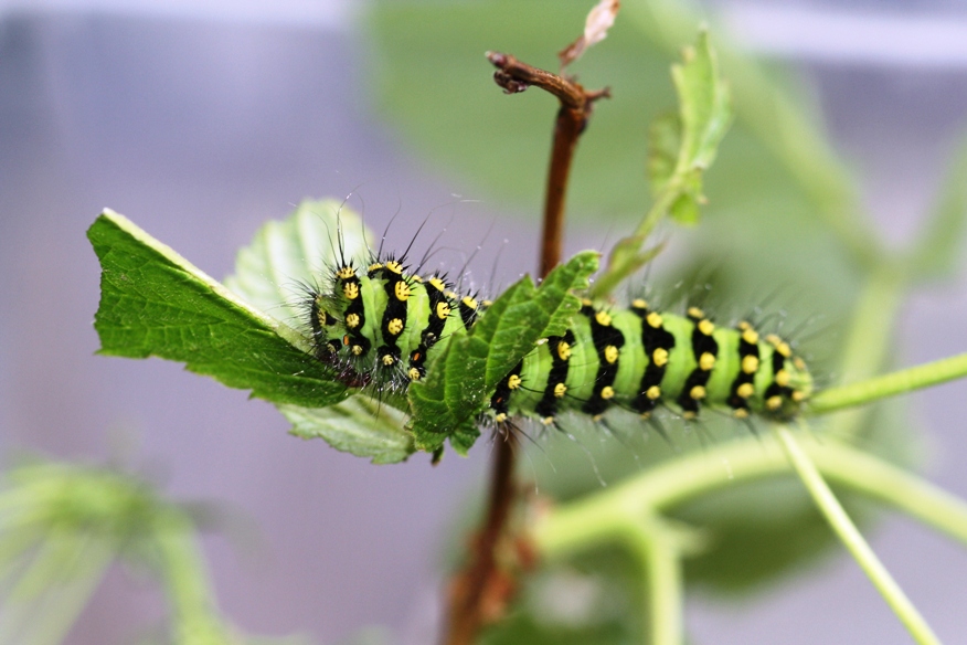 Frisch geschlüpfte Larven des Kleinen Nachtpfauenauges an einer jungen Salweide in Oberschwaben (Unlingen), Mai 2016.