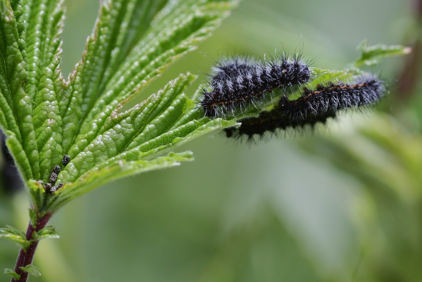 Jüngere Raupen des Kleinen Nachtpfauenauges an Mädesüß fressend in einer Feuchtbrache im Baar-Wutach-Gebiet (Blumberg-Zollhaus), Mai 2011.