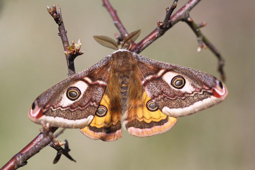 Männchen des Kleinen Nachtpfauenauges (Saturnia pavonia) aus der Zucht.