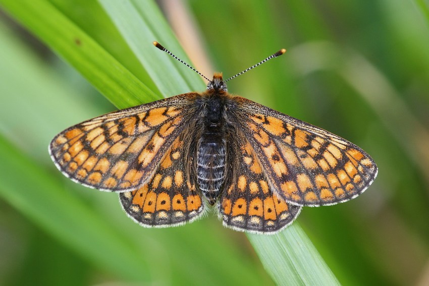 Weiblicher Falter des Goldenen Scheckenfalters (Euphydryas aurinia) auf einer Hochstromleitungstrasse bei Uppsala. Die Art war hier einer der häufigsten Falter, es konnten jedoch auch zahlreiche weitere Arten hier nachgewiesen werden.