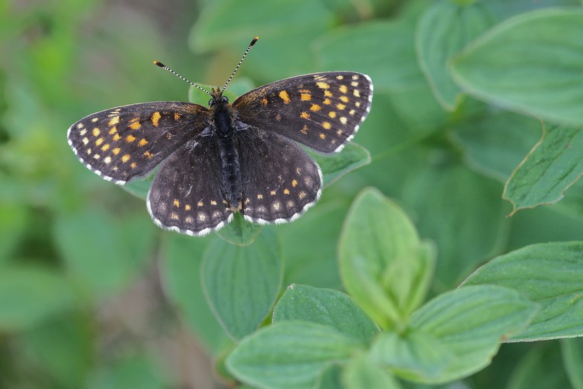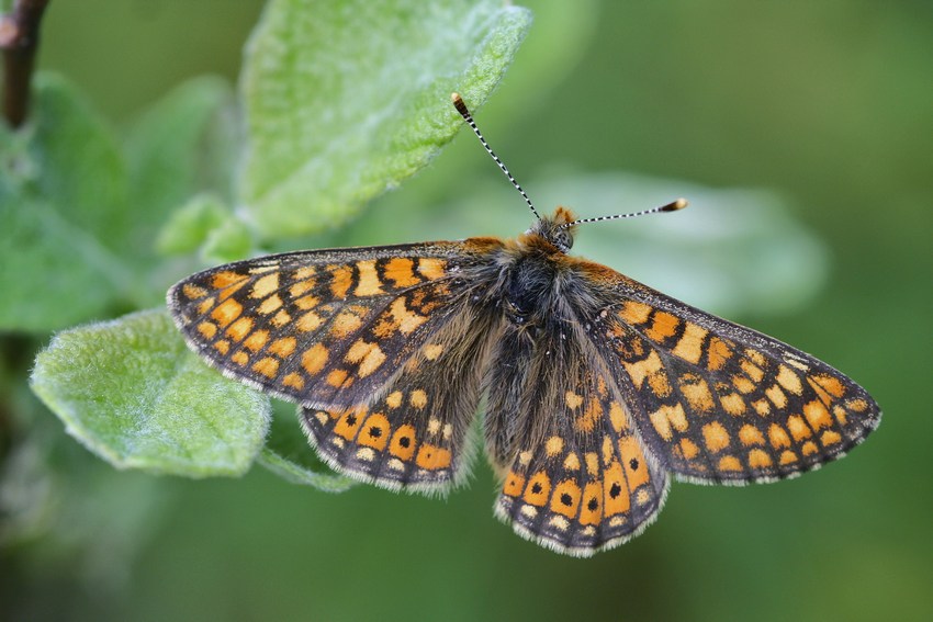 Ein Männchen des Eschen-Scheckenfalters im selben Waldgebiet. Die Wälder hatten eine sehr abwechslungsreiche Struktur, Kahlschläge unterschiedlichen Sukzessionsstadiums wechselten sich mit Hochwaldbereichen aus Nadel- und Laubwald ab, breite Wegsäume trugen außerdem zur Lichtheit bei.