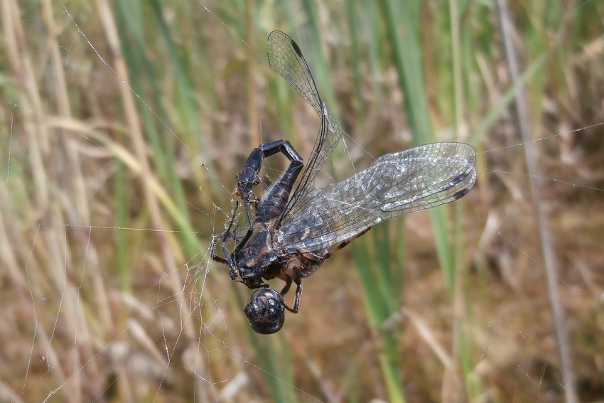 Dieses Männchen der Schwarzen Heidelibelle fiel einer Radnetzspinne zum Opfer, Oberschwaben (Baltringen), August 2015.