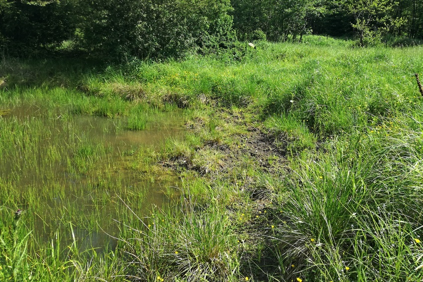 Charakteristisches Habitat der Säbel-Dornschrecke im Schönbuch (Bebenhausen); feuchte und von Offenboden geprägte Uferbereiche eines Tümpels.