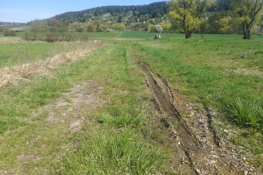 Habitat der Säbel-Dornschrecke im Albvorland (Tübingen); offenbodenreiche Fahrspuren im Feuchtgrünland.