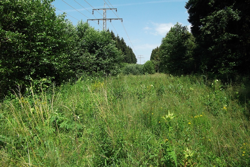 Staudenreicher und eutrophe Hochstrom-Schneise als charakteristisches Habitat der Zwitscherschrecke in Oberschwaben (Leutkirch).