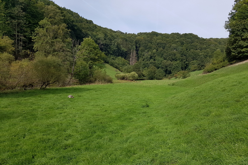 Habitat der Zwitscherschrecke am Nordrand der Schwäbischen Alb (Wiesensteig); frisch-feuchtes Bachtal.