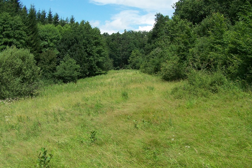Versaumte und an den Rändern verbuschende Waldwiese auf den Fildern (Filderstadt-Plattenhardt) als charakteristisches Habitat des Grünen Heupferds.