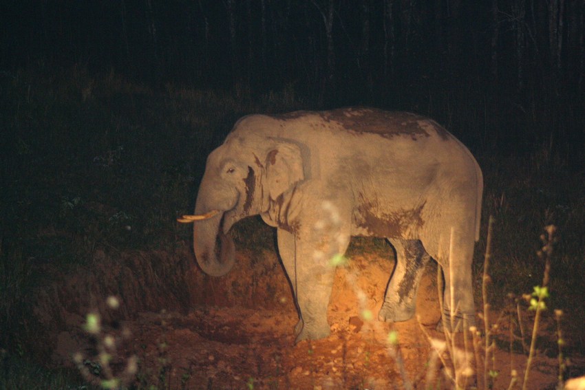 Asiatischer Elefant (Elephas maximus) bei der Aufnahme von Mineralsalzen während der nächtlichen Safari.