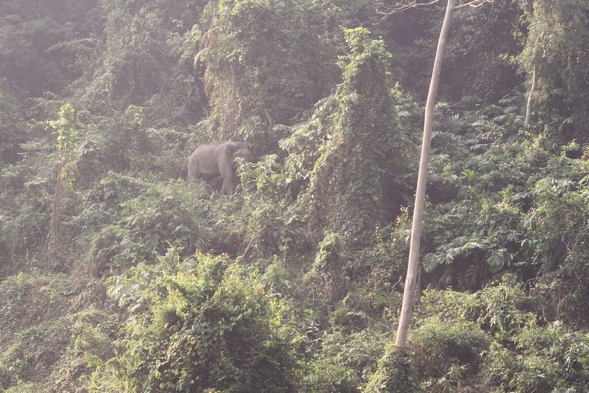 Weiterer Asiatischer Elefant an einem sehr steilen Berghang bei der Nahrungsaufnahme.