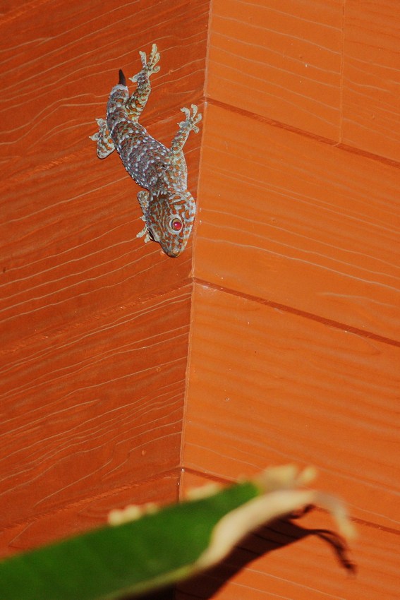 Ein Tokeh (Gekko gecko) an der Wand unseres Bungalows.