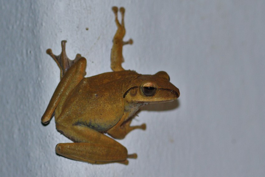 Dieser 6-8 cm große Rhacophoride war abends ab und zu in der Nähe von Lichtquellen anzutreffen.