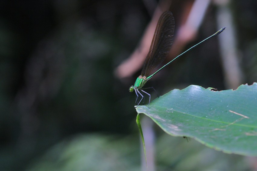 Diese Libelle, die wahrscheinlich zur Gattung Calopteryx zu rechnen ist, flog an offenen Stellen im Regenwald.