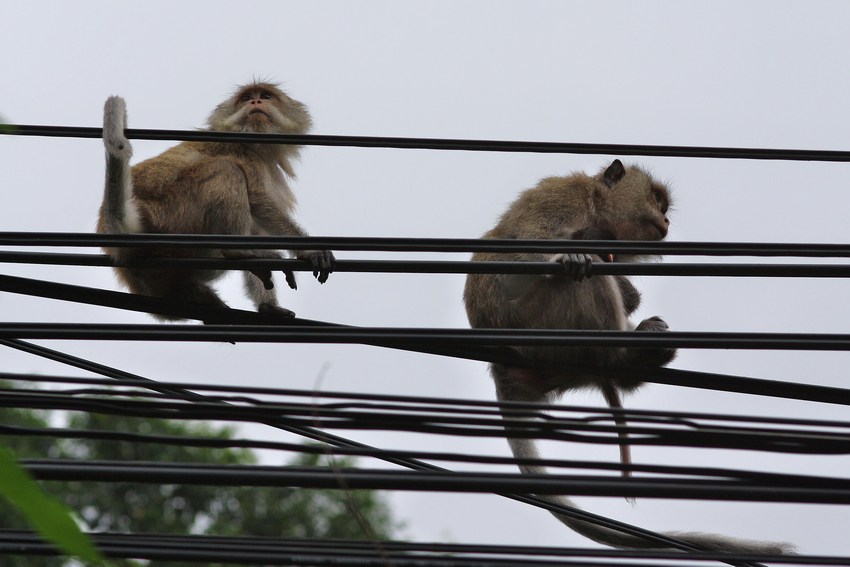 Langschwanz-Makaken (Macaca fasciularis) am Straßenrand auf Leitungen.