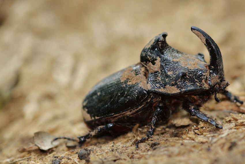 Etwa 4-5 cm großer Nashornkäfer im Laub des Regenwaldes.