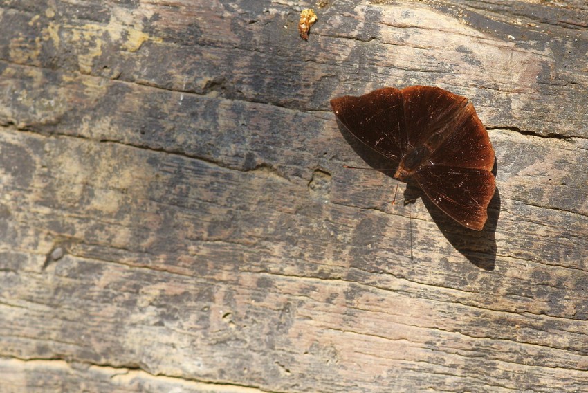 Ein Falter aus der Gattung Riodionidae beim Sonnen auf einem Holzpolter.