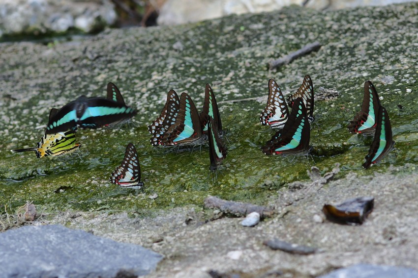 Zahlreiche Papilioniden beim Saugen an einem Abwasser-Rinnsal.
