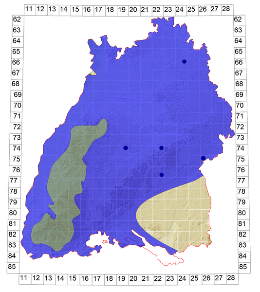 Schematische Verbreitung von T. acteon in Baden-Württemberg: