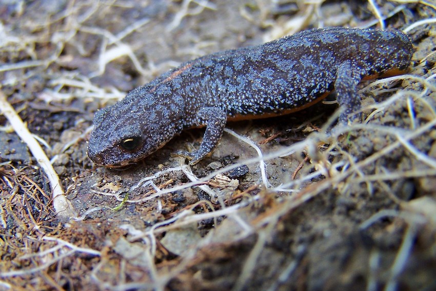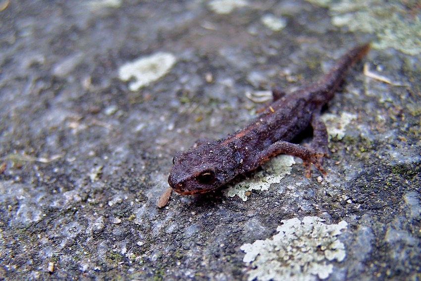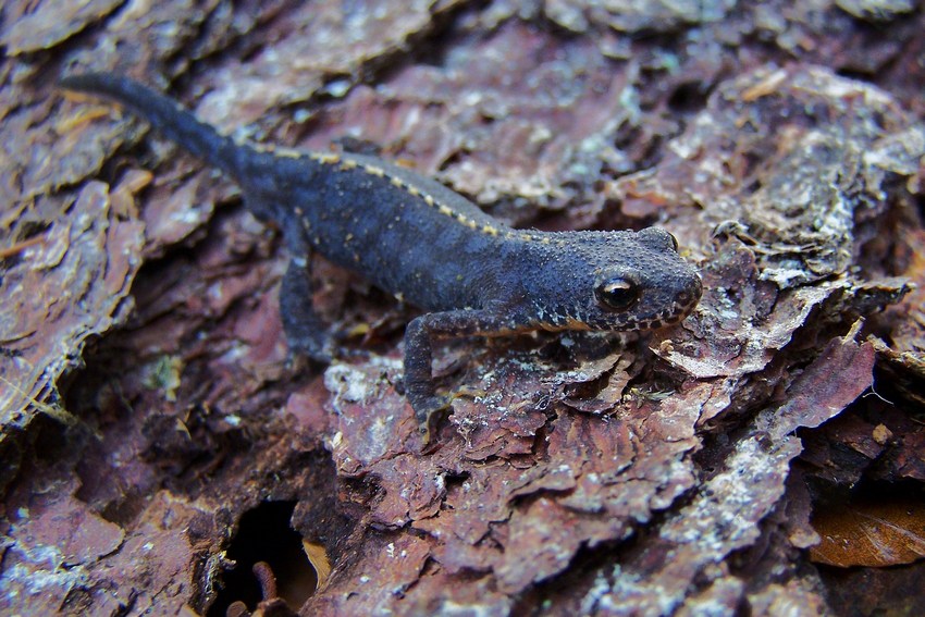 Weiterer männlicher Bergmolch im Tagesversteck im Albvorland (NSG Schaichtal), Oktober 2008.