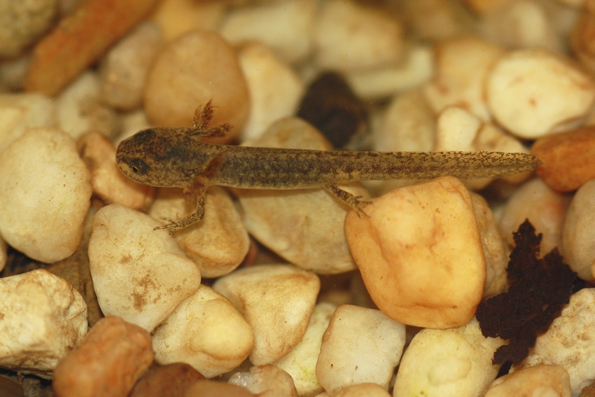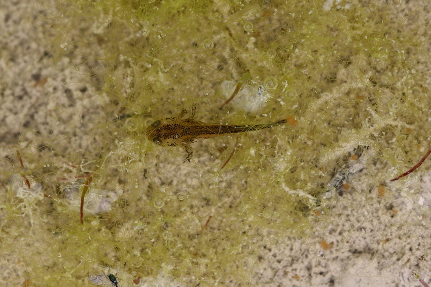 Weitere, stark pigmentierte Larve des Bergmolchs in einem Flachgewässer auf der Schwäbischen Alb (Sonnenbühl), Juni 2019.