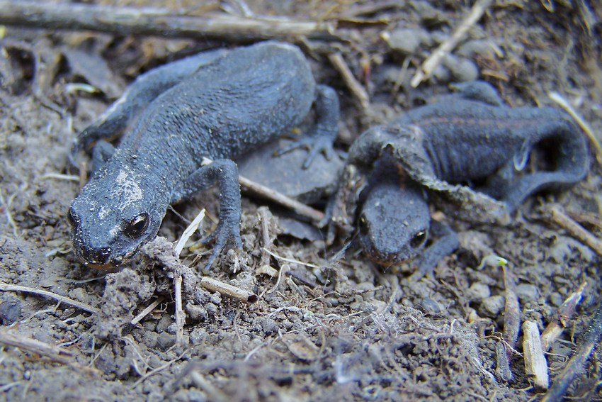 Zwei weibliche Bergmolche im Tagesversteck in den Oberen Gäuen (Sindelfingen-Darmsheim), Mai 2009.