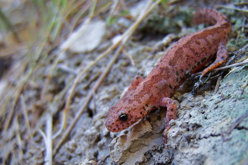 Ungewöhnlich rötlich gefärbter Bergmolch in einem Steinbruch auf der Schwäbischen Alb (Lichtenstein), Mai 2009.