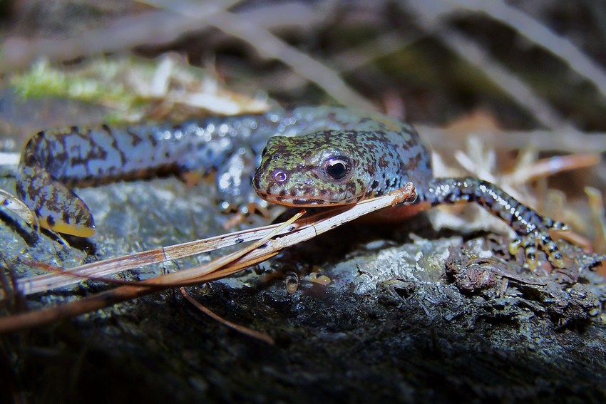 Männlicher Bergmolch (Ichthyosaura alpestris) in Landtracht in einem Steinbruch in den Oberen Gäuen (Sindelfingen-Darmsheim), Mai 2009.
