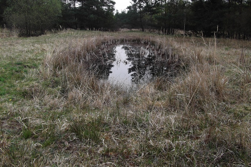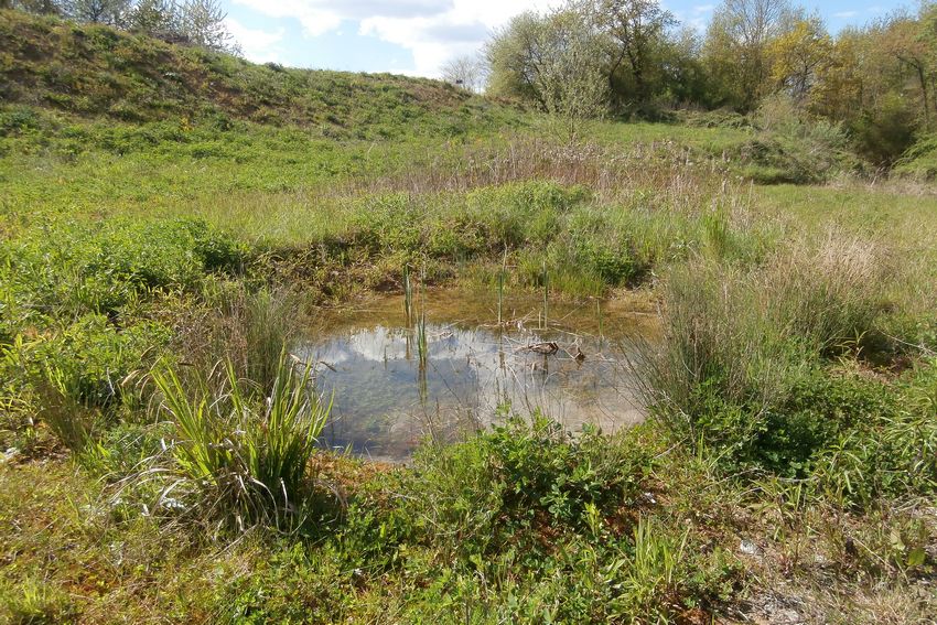 Weiteres Reproduktionsgewässer des Kammmolchs im Strom- und Heuchelberg (Heilbronn), kleiner und vollbesonnter Tümpel.