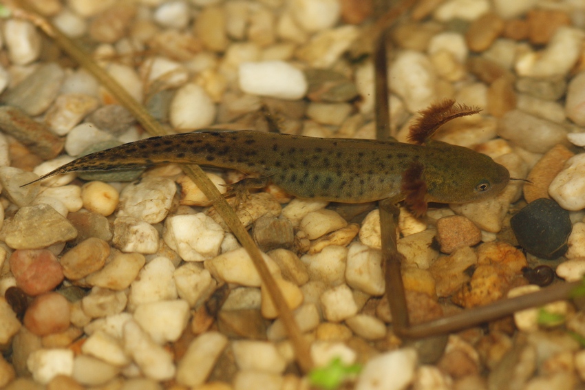 Typisch freischwimmende Larve des Kammmolchs in einem Kleingewässer im Strom- und Heuchelberg (Heilbronn), Mai 2016.