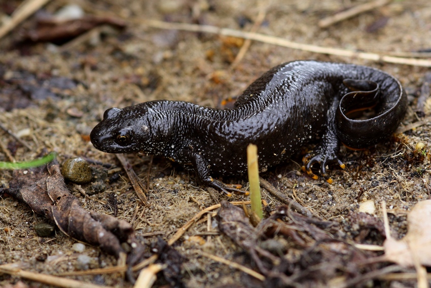 Weibchen des Kammmolchs (Triturus cristatus) an Land in Anwanderung an das Reproduktionsgewässer in Oberschwaben (Baltringen), April 2016.