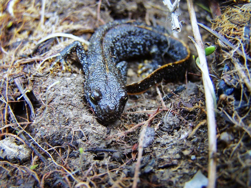 Wandernder Kammmolch in der Oberrheinebene (Philippsburg), April 2020.