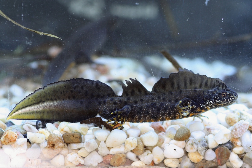 Männchen des Kammmolchs in der auffälligen Wassertracht im Albvorland (Böblingen), April 2014.