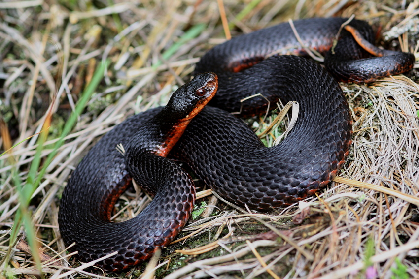 Melanistische Kreuzotter mit roter Bauchseite im württembergischen Allgäu (Isny), September 2019.
