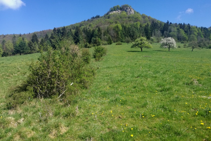 Lebensraum der Kreuzotter bei Albstadt; extensiv genutzte, frische Rinderweiden mit Einzelgehölzen.
