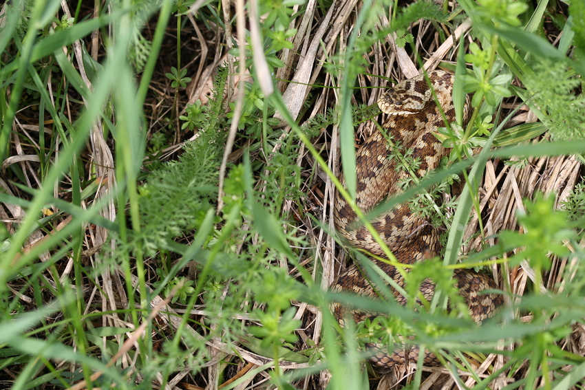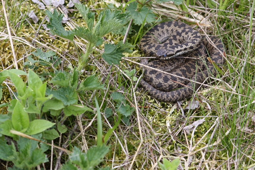 Gut getarntes Weibchen der Kreuzotter auf der Schwäbischen Alb (Onstmettingen), Mai 2022.