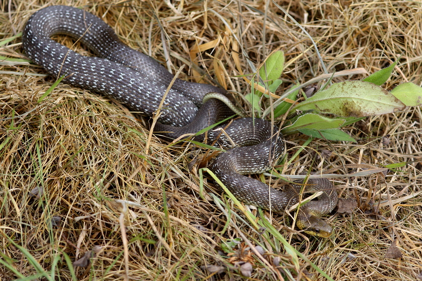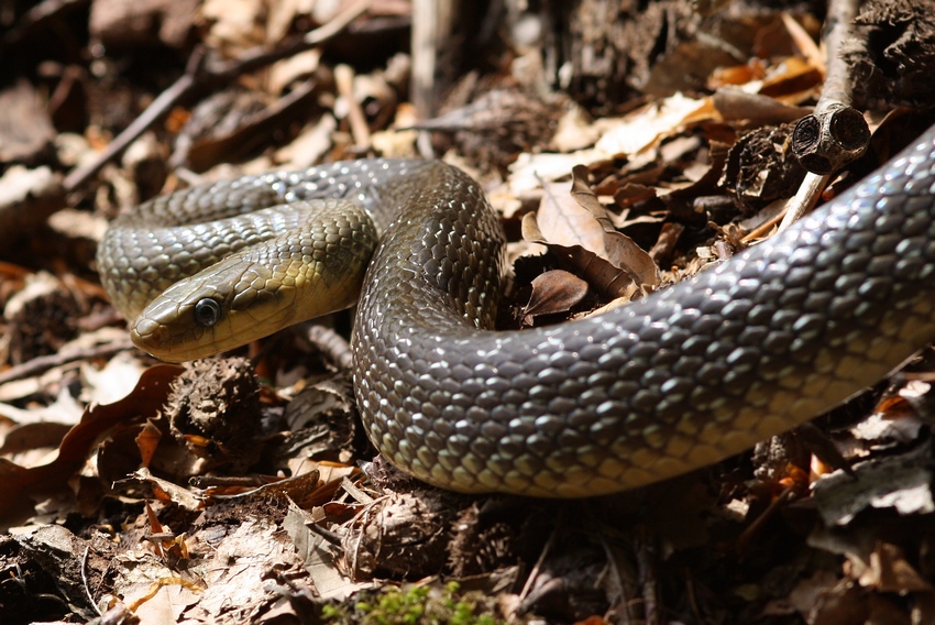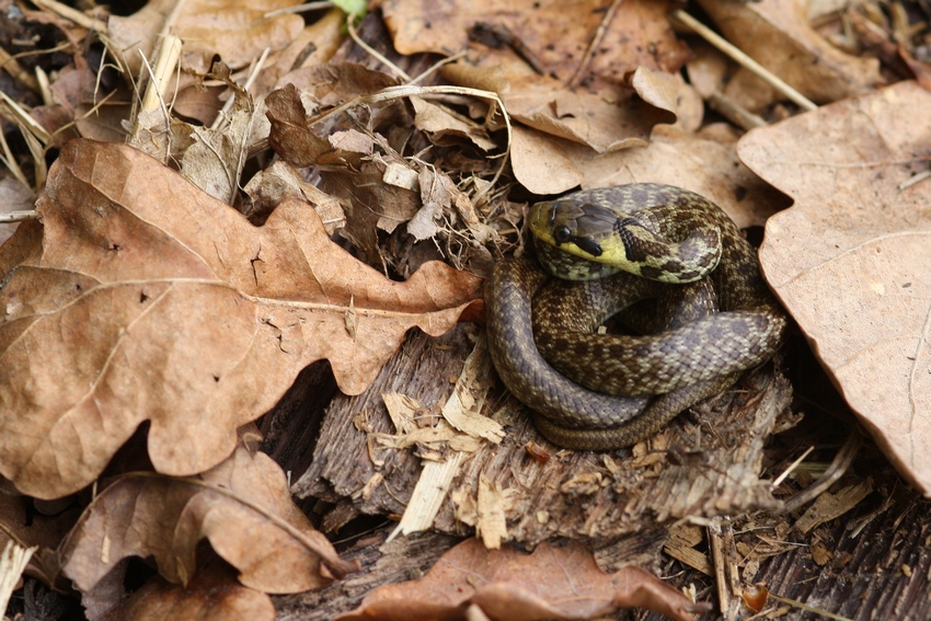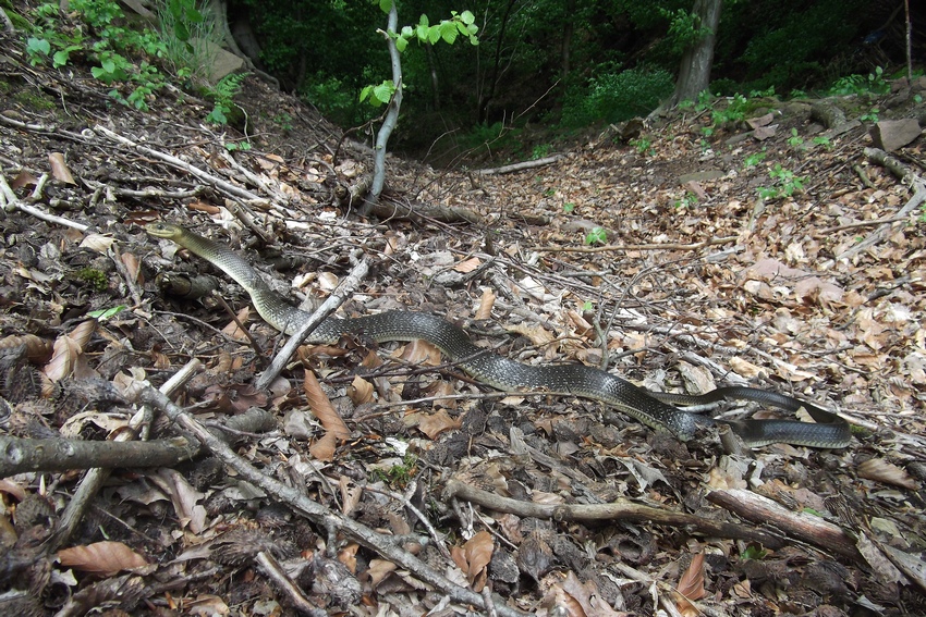 Jungtier der Äskulapnatter, gut erkennbar ist die Juvenilfärbung, Mai 2013.