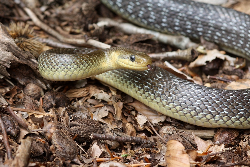Portrait der Äskulapnatter (Zamenis longissimus) im nördlichen Baden-Württemberg, Mai 2013.