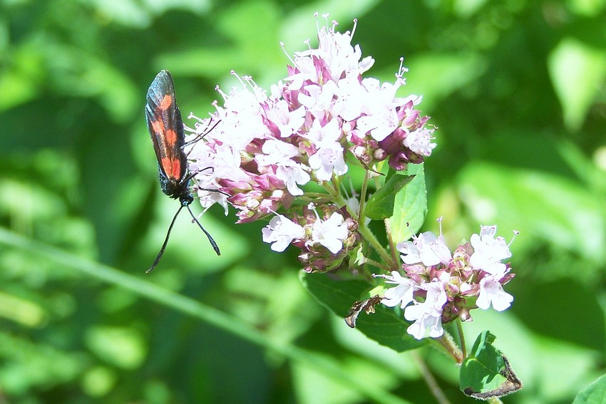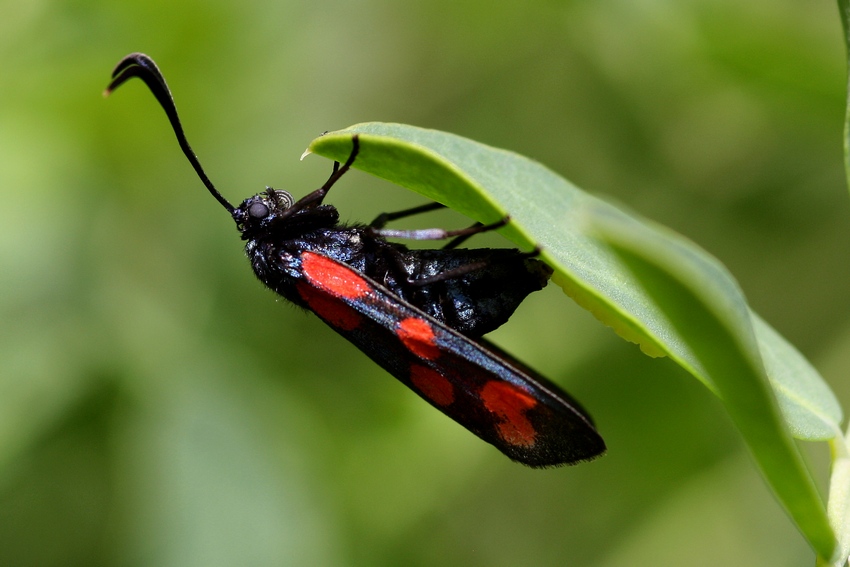 Eher untypisch gefleckte (da Fleckenpaar 5 und 6 nicht verschmolzen) Zygaena a. elegans am Albtrauf (Öschingen), Juli 2010.