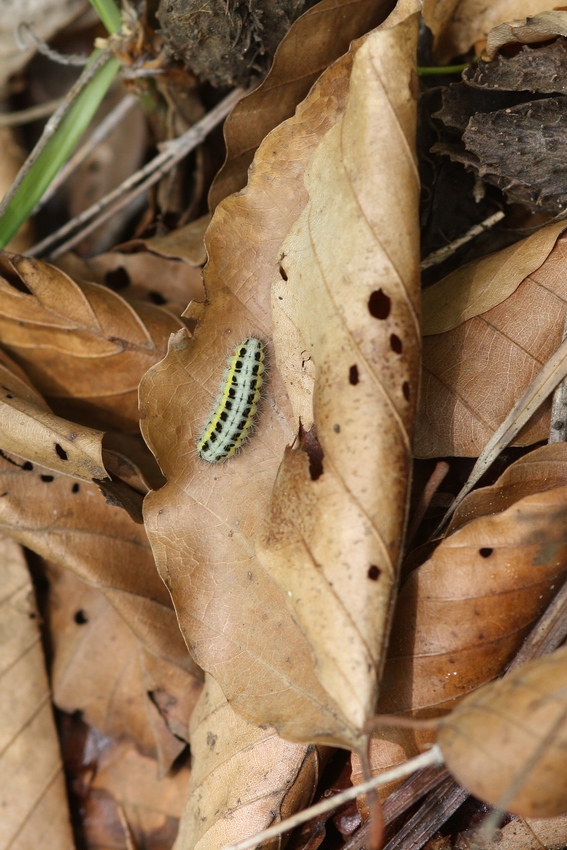 Sich sonnende Raupe von Z. a. elegans in der Aufsicht am Albtrauf (Bad Urach), Mai 2013.